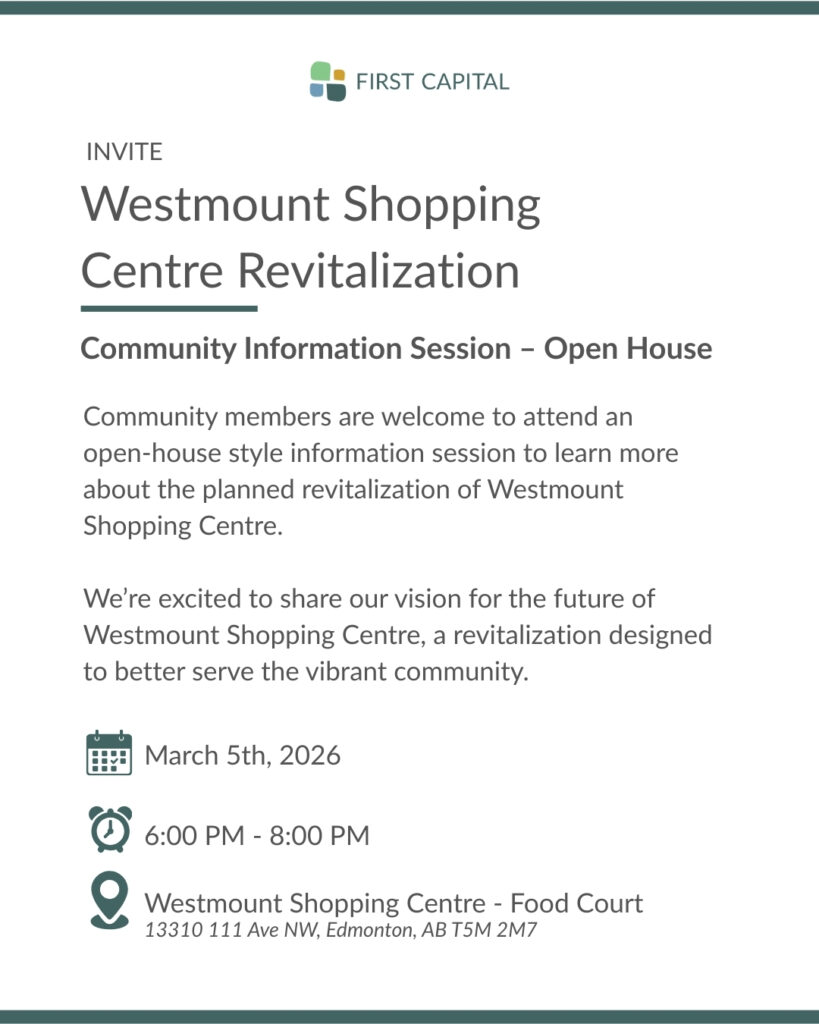 First Capital REIT invites community members to attend an open‑house style information session to learn more about the planned revitalization of Westmount Shopping Centre.